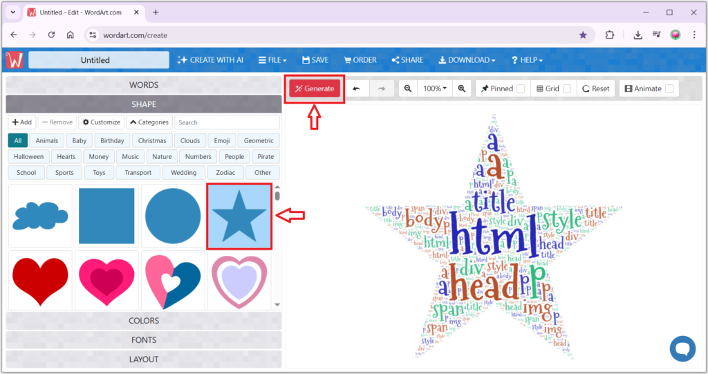 Nyní už můžete zkusit slovní mrak vygenerovat pomocí červeného tlačítka Generate.