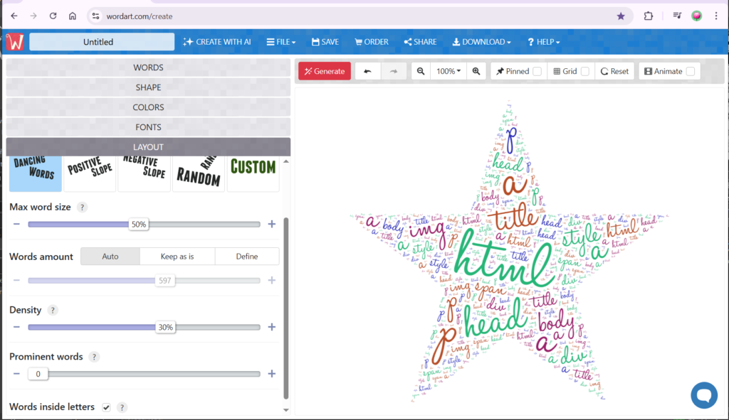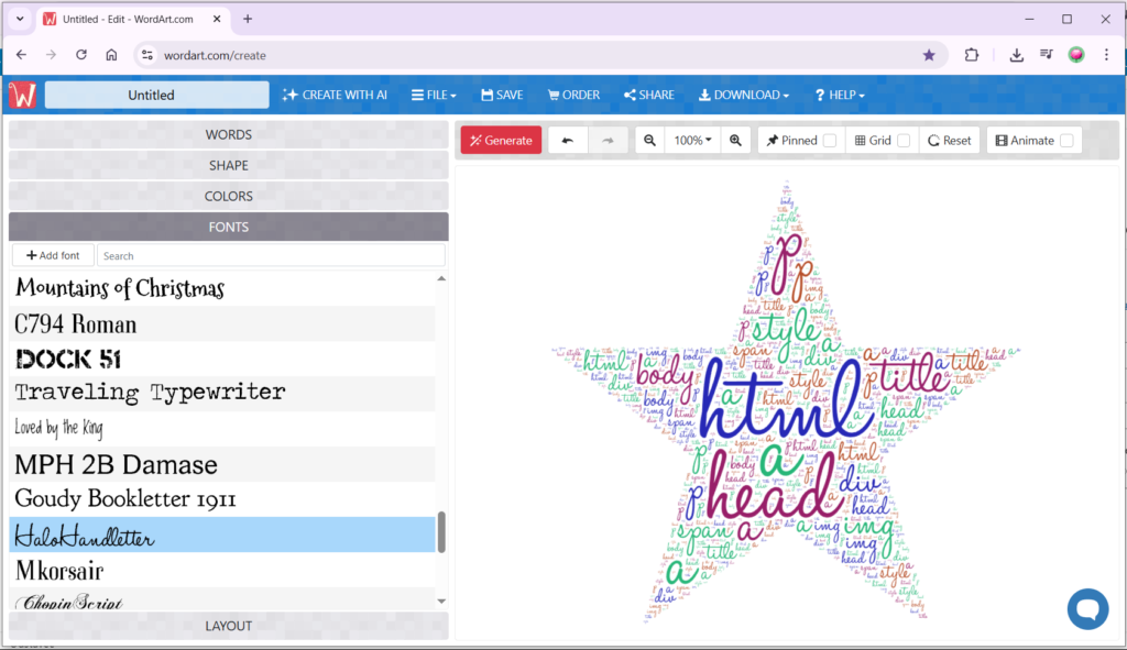 Po výběru fontu můžete opět vygenerovat slovní mrak pomocí tlačítka Generate. Generování je možné spustit kdykoliv během tvorby a promítnou se do něho všechny nastavené možnosti.
