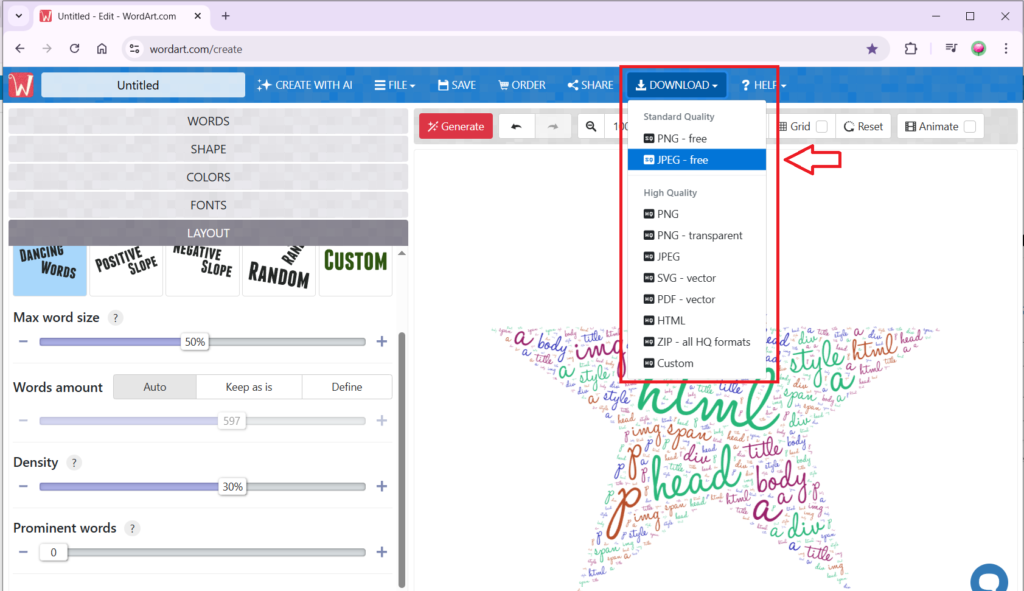 Výborně! Výsledný slovní mrak si stáhneme do počítače přes tlačítko DOWNLOAD a možnost JPEG – free.