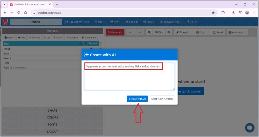Nejdříve dostanete možnost využít vygenerování slovního mraku pomocí AI. Do příslušného pole zadáte Váš požadavek. Zkoušela jsem vložit požadavek v češtině i angličtině, fungují oba jazyky. Můžete zadat např. Vygeneruj prosím červené srdce se slovy láska, srdce, Valentýn. To vše potvrdíte tlačítkem Create with AI. AI začne automaticky generovat Váš slovní mrak, který můžete poté dále upravovat.